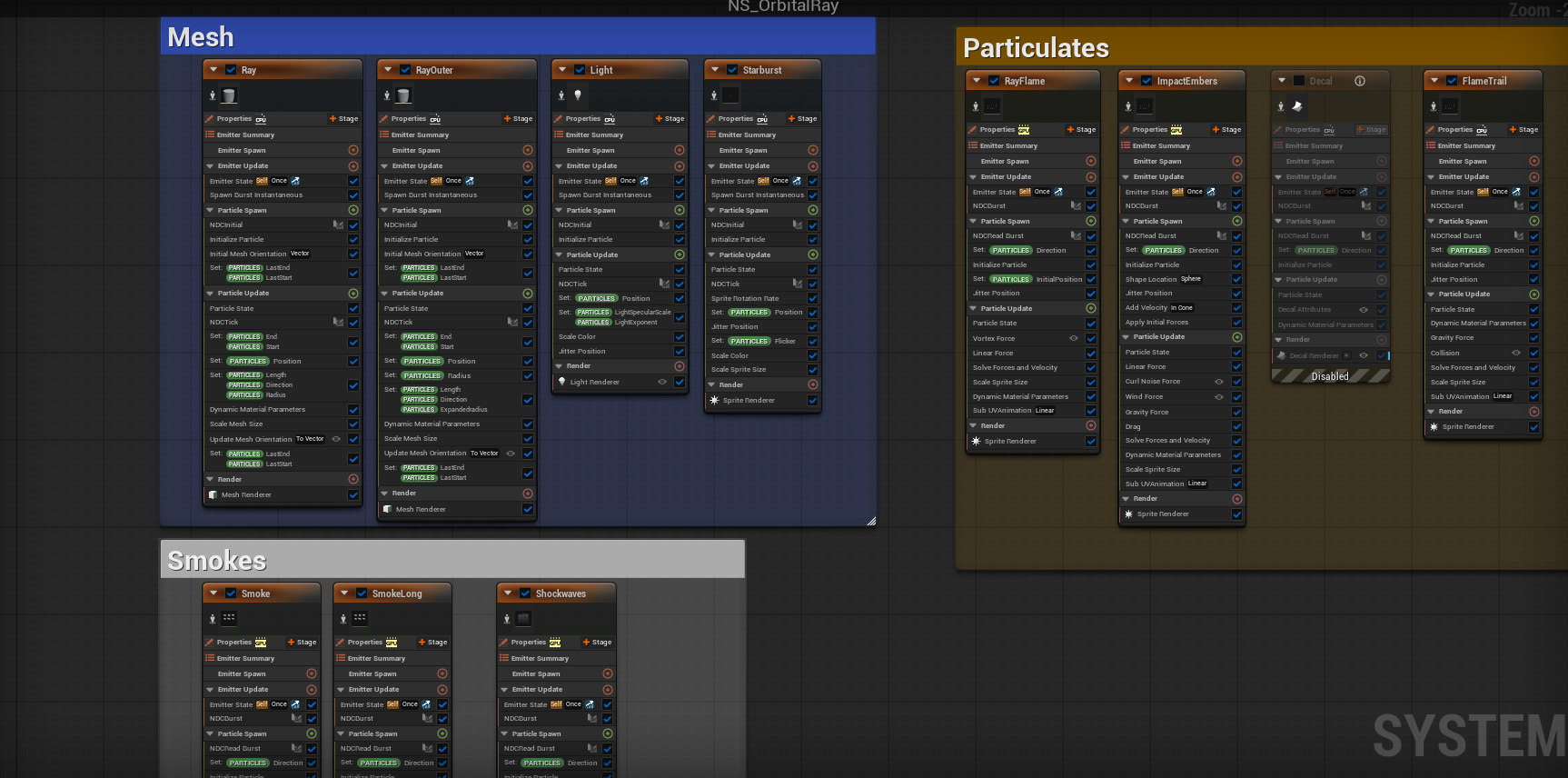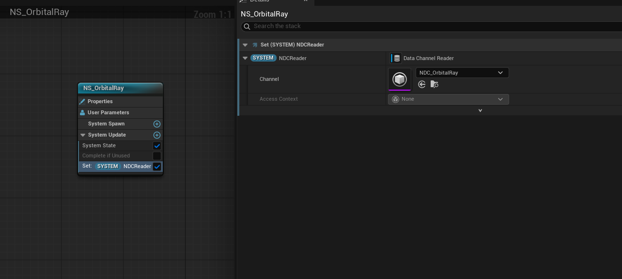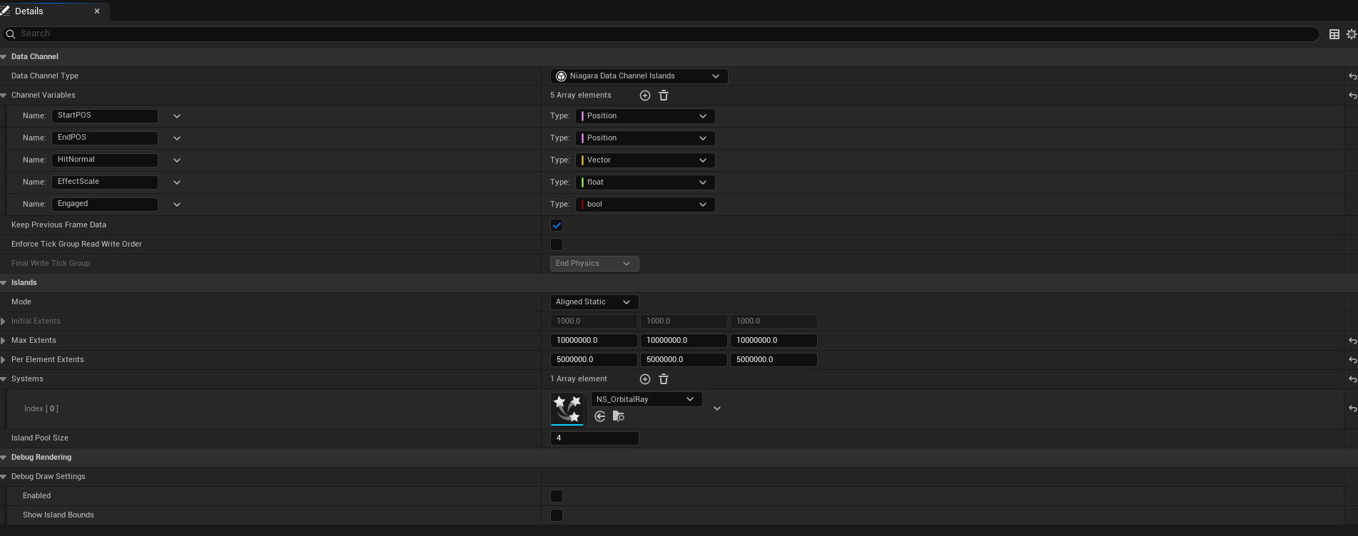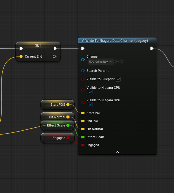 Niagara Data Channels handle all of the Niagara effect spawning. This one in specific handles the laser’s various emitters.