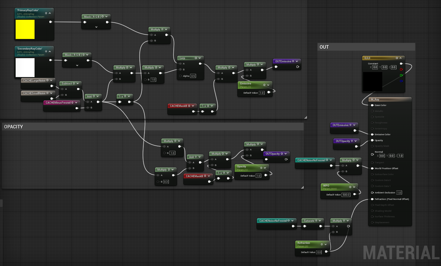 Two colors are used from a material collection. Noise is brought into world position offset to add some wobble.